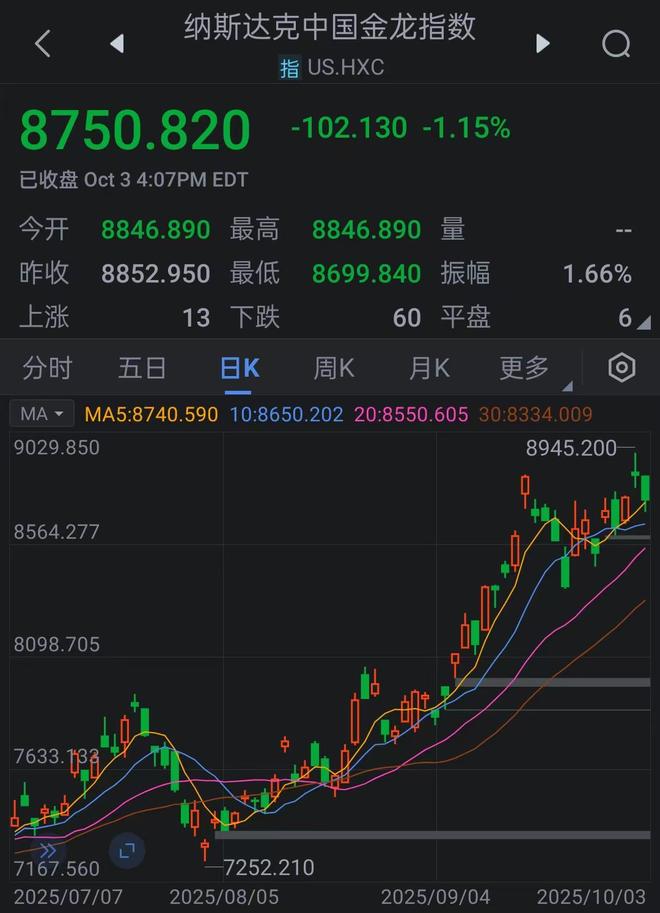 市场整体表现 - 纳斯达克中国金龙指数下跌1.15% [1] - 多数热门中概股收盘下跌 [1] 公司股价表现 - 网易股价下跌超过1% [1] - 京东股价下跌超过1% [1] - 携程股价下跌超过2% [1] - 百度股价上涨超过1% [1] - 理想汽车股价下跌超过3% [1] - 小鹏汽车股价下跌超过3% [1] - 蔚来股价下跌超过2% [1] - 富途控股股价上涨超过2% [1]