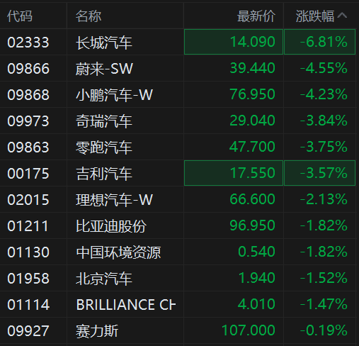 港股异动丨汽车集体走低,长城汽车跌近7%,“蔚小理”齐跌
