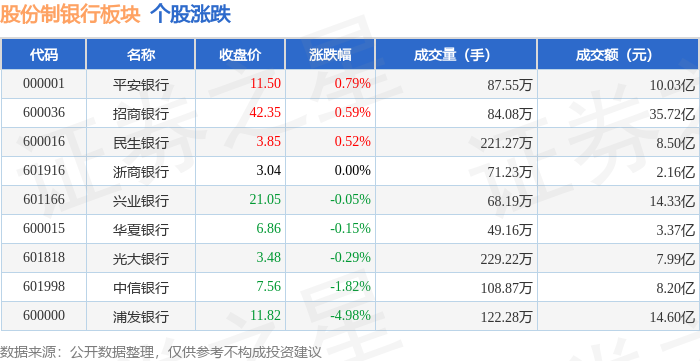 证券之星消息,1月6日股份制银行板块较上一交易日上涨0.88%,兴业银行领涨。当日上证指数报收于 4083.67,上涨1.5%。深证成指报收于14022.55,上涨1.4%。股份制银行板块个股涨跌见下表: | 代码 | 名称 | 收盘价 | 涨跌幅 | 成交量(手) | 成交额(元) | | --- | --- | --- | --- | --- | --- | | 601166 | 兴业银行 | 21.46 | 1.95% | 98.05万 | 20.81亿 | | 600000 | 浦发银行 | 12.00 | 1.52% | 121.38万 | 14.40 Z | | 000001 | 平安银行 | 11.67 | 1.48% | 130.46万 | 15.13 Z | | 600036 | 招商银行 | 42.73 | 0.90% | 92.37万 | 39.18亿 | | 600015 | 华夏银行 | 6.90 | 0.58% | 45.20万 | 3.11亿 | | 601818 | 光大银行 | 3.50 | 0.57% | 192.18万 | 6.70亿 | | 600016 | 民生银行 ...