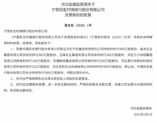 宁晋民生村镇银行变更股权获批,民生银行持股比例将升至95%
