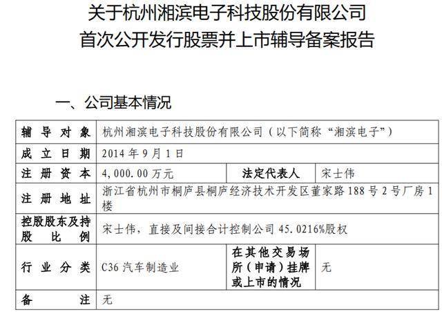 瑞财经 王敏 12月24日,杭州湘滨电子科技股份有限公司(以下简称"湘滨电子")在浙江证监局启动IPO 辅导备案,辅导机构为中信证券。 湘滨电子成立于2014年9月,法定代表人为宋士伟,注册资本4000万元。宋士伟直接及间接合计控制公 司45.0216%股权。宋士伟担任董事长、经理。 湘滨电子国家专精特新"小巨人"企业,致力于国内外乘用车、商用车电动力转向器、天窗、高档可调管 柱及功能需求的研发、制造以及技术服务,是奇瑞、吉利、一汽、零跑、日产等多家国内主要汽车品牌 制造企业的配套供应商。 | 辅导对象 | 杭州湘滨电子科技股份有限公司(以下简称"湘滨电子") | | --- | --- | | 成立日期 | 2014年9月1日 | | 并 好 资 本 | 4,000.00 万元 法定代表人 宋士伟 | | 法 我 出 址 | 浙江省杭州市桐庐县桐庐经济技术开发区董家路 188 号 2 号厂房 1 在 | | 控股股东及持 股 比例 | 宋士伟,直接及间接合计控制公司 45.0216%股权 | | 行业分类 | 在其他交易场 C36 汽车制造业 所(申请)挂牌 无 | | | 或上市的情况 | | 注 备 | ...