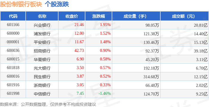 | 代码 | 名称 | 收盘价 | 涨跌幅 | 成交量(手) | 成交额(元) | | --- | --- | --- | --- | --- | --- | | 601998 | 中信银行 | 7.41 | 0.14% | 68.89万 | 5.07亿 | | 601916 | 浙商银行 | 3.03 | -0.33% | 71.92万 | 2.18亿 | | 600016 | 民生银行 | 3.83 | -0.52% | 242.43万 | 9.27亿 | | 601818 | 光大银行 | 3.47 | -0.57% | 163.67万 | 5.70亿 | | 600015 | 华夏银行 | 6.79 | -0.59% | 63.97万 | 4.35 Z | | 000001 | 平安银行 | 11.51 | -1.12% | 110.01万 | 12.69亿 | | 600036 | 招商银行 | 41.58 | -1.35% | 111.57万 | 46.43 Z | | 601166 | 兴业银行 | 20.92 | -1.51% | 68.31万 | 14.31亿 | | 600000 | 浦发 ...