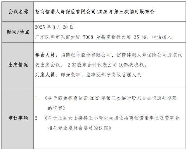 公司治理变动 - 王颖女士接替王小青先生担任招商信诺董事长及董事会相关专业委员会委员 议案获代表公司100%表决权的股东一致通过 [1] - 王颖现任招商银行副行长 为招商银行唯一女性副行长 拥有28年招行任职经历 历任北京分行行长助理 天津分行行长 深圳分行行长等职 [2][3] 公司股权结构 - 招商信诺由信诺健康人寿保险公司与招商银行股份有限公司各持股50% [3] - 公司注册资本28亿元 法定代表人原为王小青 [3] 财务表现 - 截至2025年6月末 招商信诺总资产2366.89亿元 净资产170.75亿元 [3] - 2025年上半年实现净利润3.08亿元 较上年同期2.36亿元增长30.51% [3] 高管背景 - 王颖出生于1972年11月 南京大学政治经济学硕士 经济师 2023年11月起任招商银行副行长 [3] - 招商银行高管团队包括缪建民(董事长) 王良(首席执行官 持股30万股 年薪296.2万元) 彭家文(副行长 持股22.19万股 年薪276.1万元)等 [2]