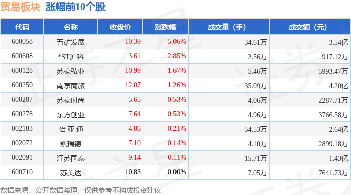 证券之星消息,12月25日贸易板块较上一交易日上涨0.61%,五矿发展领涨。当日上证指数报收于 3959.62,上涨0.47%。深证成指报收于13531.41,上涨0.33%。贸易板块个股涨跌见下表: | 代码 | 名称 | 收盘价 | 涨跌幅 | 成交量(手) | 成交额(元) | | --- | --- | --- | --- | --- | --- | | 601061 | 中信金属 | 13.99 | -2.44% | 27.31万 | 3.79亿 | | 000151 | 中成股份 | 12.26 | -0.33% | 6.57万 | 8026.99万 | | 600981 | 苏蒙汇鸿 | 3.31 | -0.30% | 38.97万 | 1.29亿 | | 600710 | 苏美达 | 10.83 | 0.00% | 7.05万 | 7641.73万 | | 002091 | 江苏国泰 | 9.14 | 0.11% | 15.71万 | 1.43亿 | | 002072 | 凯瑞德 | 7.10 | 0.14% | 4.10万 | 2899.18万 | | 002183 | 怡亚通 | 4.86 ...