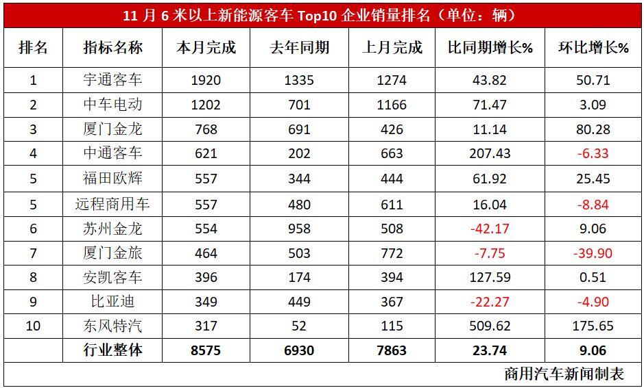 宇通/中车居冠亚,厦门金龙冲上第三!新能源客车11月热销8575辆再创新高