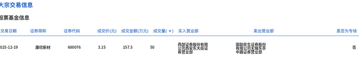 12月19日,康欣新材大宗交易成交50万股,成交额157.5万元,占当日总成交额的0.51%,成交价3.15 元,较市场收盘价3.15元持平。 | 交易日期 | 证券简称 | 证券代码 | 成交价(元) 成交金额(万元) 成交量( *) 买入营业部 | | | | 卖出营业部 | 是否为专场 | | --- | --- | --- | --- | --- | --- | --- | --- | --- | | 025-12-19 | 康欣新材 | 600076 | 3.15 157.5 | કા | 感情绪累笑想醒 | 量覆盖美贸器等 | | ya | ...