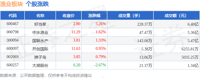 以上内容为证券之星据公开信息整理,由AI算法生成(网信算备310104345710301240019号),不构成投资建议。 | 代码 | 名称 | 主力净流入 (元) | 主力净占比 游资净流入 (元) | | 游资净占比 散户净流入 (元) | | 散户净占比 | | --- | --- | --- | --- | --- | --- | --- | --- | | 600467 | 好当家 | 5237.84万 | 8.19% | 1568.16万 | 2.45% | -6805.99万 | -10.64% | | 000798 中水渔业 | | 4216.53万 | 7.87% | 3400.18万 | 6.35% | -7616.71万 | -14.22% | | 300094 国联水产 | | 2954.24万 | 5.40% | 4448.49万 | 8.13% | -7402.72万 | -13.54% | | 600097 | 开创国际 | 311.36万 | 4.98% | 28.00万 | 0.45% | -339.36万 | -5.42% | | 002069 | 獐子岛 | 260.0 ...