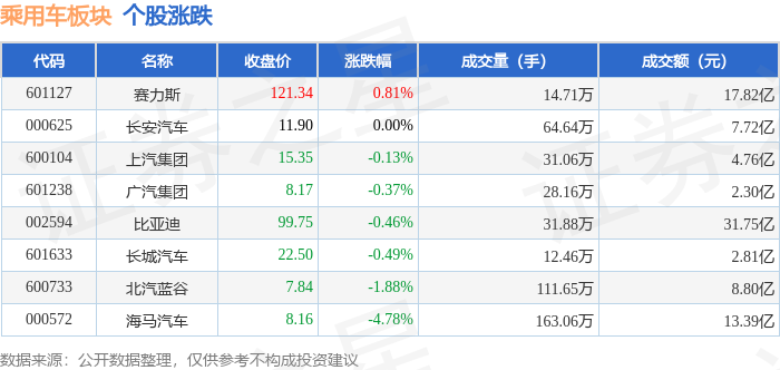 市场整体表现 - 2023年12月30日,乘用车板块整体下跌0.25%,表现弱于深证成指(上涨0.49%),与上证指数(下跌0.0%)基本持平 [1] - 板块内个股表现分化,海马汽车领跌,跌幅达4.78%,赛力斯领涨,涨幅为0.81% [1] 个股价格与交易情况 - **赛力斯**:收盘价121.34元,上涨0.81%,成交额17.82亿元 [1] - **比亚迪**:收盘价99.75元,下跌0.46%,成交额31.75亿元,为板块内成交额最高个股 [1] - **长安汽车**:收盘价11.90元,涨跌幅为0.00%,成交额7.72亿元 [1] - **上汽集团**:收盘价15.35元,下跌0.13%,成交额4.76亿元 [1] - **广汽集团**:收盘价8.17元,下跌0.37%,成交额2.30亿元 [1] - **长城汽车**:收盘价22.50元,下跌0.49%,成交额2.81亿元 [1] - **北汽蓝谷**:收盘价7.84元,下跌1.88%,成交额8.80亿元 [1] - **海马汽车**:收盘价8.16元,下跌4.78%,成交额13.39亿元 [1] 板块资金流向 - 当日乘用车板块整体呈现主力资金和游资净流出,散户资金净流入 [1] - 板块主力资金净流出8531.2万元 [1] - 板块游资资金净流出1.86亿元 [1] - 板块散户资金净流入2.71亿元 [1] 个股资金流向明细 - **赛力斯**:主力资金净流入8943.67万元,占比5.02%,是板块内唯一获得主力资金显著净流入的个股 [2] - **比亚迪**:主力资金净流入2463.92万元,占比0.78%,但游资净流出6257.67万元 [2] - **长安汽车**:主力资金净流入327.12万元,占比0.42% [2] - **长城汽车**:主力资金净流出66.38万元,占比-0.24% [2] - **上汽集团**:主力资金净流出1793.95万元,占比-3.77%,散户资金净流入2759.15万元,占比5.80% [2] - **广汽集团**:主力资金净流出1925.00万元,占比-8.38%,散户资金净流入1888.74万元,占比8.22% [2] - **北汽蓝谷**:主力资金净流出4636.47万元,占比-5.27%,游资净流出4595.56万元,占比-5.22%,但散户资金大幅净流入9232.03万元,占比10.49% [2] - **海马汽车**:主力资金净流出1.18亿元,占比-8.84%,为板块内主力资金净流出额最高个股,但散户资金净流入1.32亿元,占比9.84% [2]