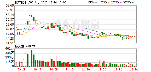 证券时报·数据宝统计显示,北方稀土今日收盘价为45.62元,上涨0.35%,日换手率为1.16%,成交额为 19.05亿元,全天主力资金净流出9659.35万元,近5日该股累计上涨1.94%,近5日资金合计净流入 8153.68万元。 | 成交量 | 成交金额 | 成交价 | 相对当日收盘 | | | | --- | --- | --- | --- | --- | --- | | (万 | (万元) | 格 | 折溢价(%) | 买方营业部 | 卖方营业部 | | 股) | | (元) | | | | | 24.00 | 1094.88 | 45.62 | 0.00 | 华泰证券股份有限公司北京西三 | 国泰海通证券股 | | | | | | 环国际财经中心证券营业部 | 份有限公司总部 | 两融数据显示,该股最新融资余额为68.88亿元,近5日减少1.10亿元,降幅为1.57%。 (文章来源:证券时报网) 据天眼查APP显示,中国北方稀土(集团)高科技股份有限公司成立于1997年09月12日,注册资本 361506.5842万人民币。(数据宝) 北方稀土12月24日大宗交易平台出现一笔成交,成交量24.00 ...