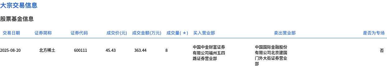 大宗交易概况 - 8月20日北方稀土发生大宗交易成交8万股,成交金额363.44万元,占当日总成交额比例0.02% [1] - 成交价格45.43元与市场收盘价完全持平,未出现折价或溢价情况 [1] 交易细节 - 买入方为中国中金财富证券有限公司福州五四路证券营业部 [2] - 卖出方为中国国际金融股份有限公司北京建国门外大街证券营业部 [2] - 证券代码600111,单笔成交额363.44万元 [1][2] 交易结构 - 交易通过大宗交易平台完成,买卖双方均为机构营业部 [2] - 成交价与二级市场收盘价一致,显示交易双方按市价协商达成 [1][2]