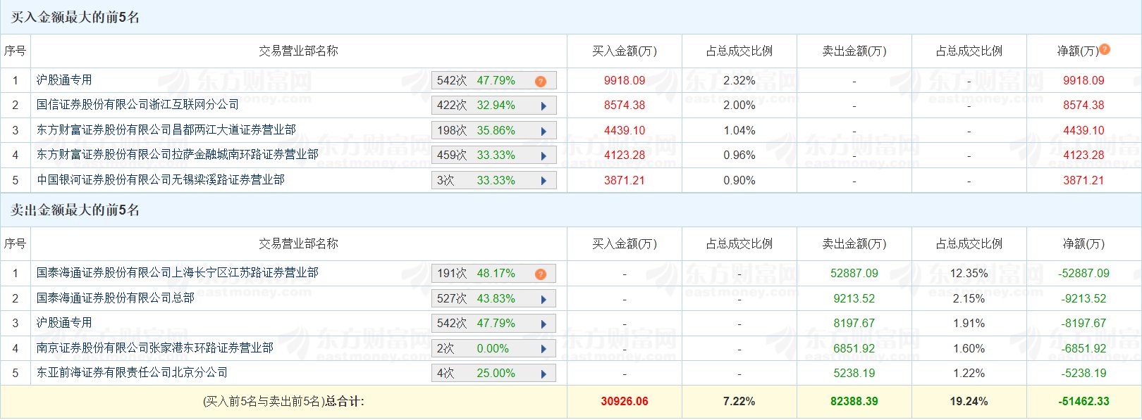 龙虎榜丨航天机电跌停,国泰海通证券上海长宁区江苏路营业部卖出5.29亿元