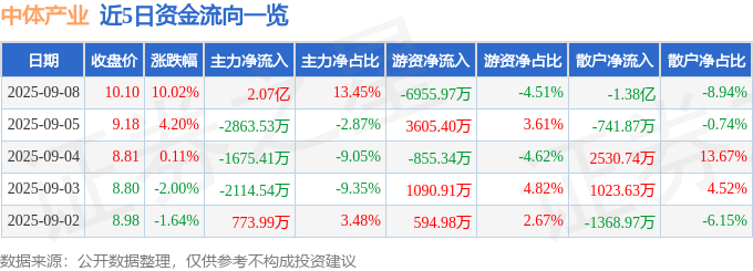 股价表现 - 9月8日涨停收盘价10.1元,单日涨幅10.02% [1] - 当日9点35分涨停,期间15次打开涨停 [1] - 收盘封单资金1165.88万元,占流通市值0.12% [1] 政策驱动因素 - 国务院拟于9月9日发布《关于释放体育消费潜力进一步推进体育产业高质量发展的意见》 [1] - 政策推动体育消费潜力释放,市场提前反应政策预期 [1] 公司竞争优势 - 体育总局控股央企,具备体育产业国家队定位 [1] - 业务覆盖赛事运营、体育彩票及地产板块,多元化布局契合行业发展趋势 [1] - 战略合作深化及全产业链整合能力增强市场长期发展信心 [1] 资金流向数据 - 主力资金净流入2.07亿元,占总成交额13.45% [1] - 游资资金净流出6955.97万元,占总成交额4.51% [1] - 散户资金净流出1.38亿元,占总成交额8.94% [1] - 近5日主力资金波动显著,9月5日净流出2863.53万元(占比-2.87%),9月2日净流入773.99万元(占比3.48%) [1] 板块联动效应 - 所属赛马概念板块当日上涨2.75% [1] - 足球概念板块上涨2.45%,彩票概念板块上涨1.83% [1] - 体育产业与房地产板块形成联动,同板块个股活跃带动资金关注 [1] 历史股价走势 - 近5日股价波动区间8.80-10.10元 [1] - 9月5日收盘价9.18元(单日涨4.20%),9月4日收盘价8.81元(单日涨0.11%) [1]