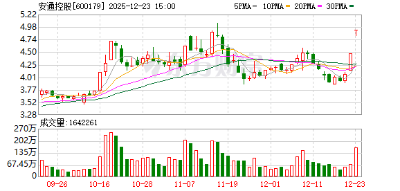 股价表现与交易数据 - 安通控股股价盘中涨停,已连续3个交易日涨停,截至统计时点报5.41元[2] - 连续涨停期间,该股累计上涨33.25%,累计换手率为12.07%[2] - 当日换手率为5.98%,成交量2.31亿股,成交金额11.86亿元,涨停板封单金额为4.46亿元[2] 市值与资金流向 - 公司最新A股总市值达228.93亿元,A股流通市值为208.95亿元[2] - 主力资金在连续涨停的两个交易日(2025.12.22和2025.12.23)分别净流入12555.49万元和2637.59万元[2] - 在此前的多个交易日(如2025.12.10至2025.12.19期间),主力资金多数为净流出状态[2] 融资交易与龙虎榜数据 - 该股最新两融余额为5.98亿元,其中融资余额5.93亿元[2] - 融资余额较前一个交易日增加1474.49万元,环比增长2.55%,但近3日累计减少537.12万元,环比下降0.90%[2] - 因股价异动上榜龙虎榜,数据显示沪股通累计净买入4247.97万元,营业部席位合计净卖出1096.03万元[2] 公司基本信息 - 安通控股股份有限公司成立于1998年10月30日,注册资本为423152.6979万人民币[2]