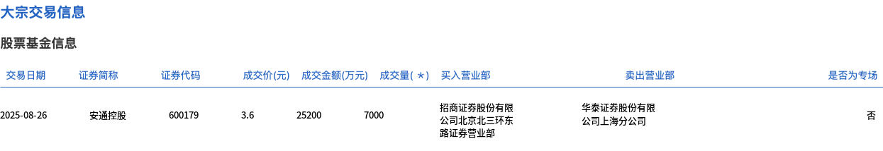 交易概况 - 2025年8月26日安通控股发生大宗交易,成交量为7000万股,成交金额达2.52亿元,占当日总成交额的24.21% [1] - 成交价格为3.6元/股,与市场收盘价3.6元完全持平 [1] 交易细节 - 证券代码为600179,买方营业部为招商证券股份有限公司北京北三环东路营业部 [2] - 卖方营业部为华泰证券股份有限公司上海分公司 [2] - 成交金额25200万元对应成交量7000万股,单价3.6元/股 [2]
