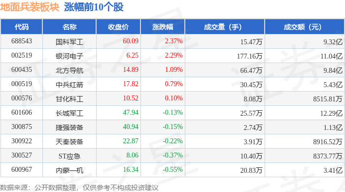 从资金流向上来看,当日地面兵装板块主力资金净流出1.21亿元,游资资金净流出9145.36万元,散户资 金净流入2.12亿元。地面兵装板块个股资金流向见下表: | 代码 | 名称 | 收盘价 | 涨跌幅 | 成交量(手) | 成交额(元) | | | --- | --- | --- | --- | --- | --- | --- | | 688543 | 国科车工 | 60.09 | 2.37% | 15.47万 | | 9.32亿 | | 002519 | 银河电子 | 6.25 | 2.29% | 177.16万 | | 11.04亿 | | 600435 | 北方导航 | 14.89 | 1.09% | 66.47万 | | 9.84亿 | | 000519 | 中兵红箭 | 17.82 | 0.79% | 30.45万 | | 5.43亿 | | 000576 | 甘化科工 | 10.52 | 0.10% | 8.08万 | | 8515.81万 | | 601606 | 长城军工 | 47.94 | -0.13% | 25.57万 | | 12.29亿 | | 300875 | 捷强装备 | 40. ...