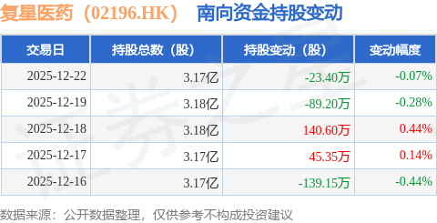 证券之星消息,12月22日南向资金减持23.4万股复星医药(02196.HK)。近5个交易日中,获南向资金 减持的有3天,累计净减持65.8万股。近20个交易日中,获南向资金增持的有11天,累计净增持97.95万 股。截至目前,南向资金持有复星医药(02196.HK)3.17亿股,占公司已发行普通股的57.48%。 | 交易日 | 持股总数(股) | 持股变动(股) | 变动幅度 | | --- | --- | --- | --- | | 2025-12-22 | 3.17亿 | -23.40万 | -0.07% | | 2025-12-19 | 3.18亿 | -89.20万 | -0.28% | | 2025-12-18 | 3.18亿 | 140.60万 | 0.44% | | 2025-12-17 | 3.17亿 | 45.35万 | 0.14% | | 2025-12-16 | 3.17亿 | -139.15万 | -0.44% | 上海复星医药(集团)股份有限公司是一家主要从事医药产品研发、制造与销售的中国公司。该公司经 营五个分部。制药分部主要从事创新药、成熟医药产品制造和疫苗业务。医疗器械与医 ...