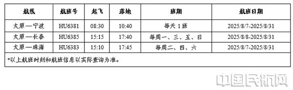海南航空暑运新增太原—宁波、太原—长春、太原—珠海航线
