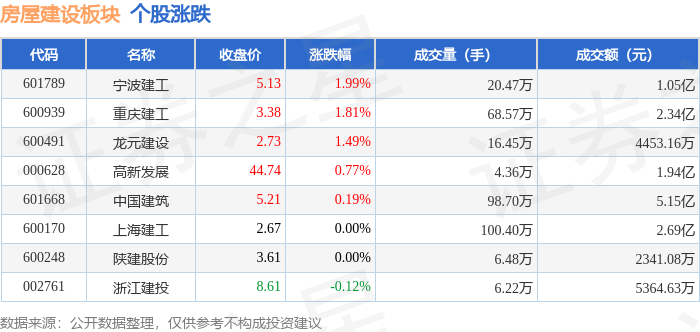 证券之星消息,12月25日房屋建设板块较上一交易日上涨0.26%,宁波建工领涨。当日上证指数报收于 3959.62,上涨0.47%。深证成指报收于13531.41,上涨0.33%。房屋建设板块个股涨跌见下表: | 代码 | 名称 | 收盘价 | 涨跌幅 | 成交量(手) | 成交额(元) | | --- | --- | --- | --- | --- | --- | | 601789 | 宁波建工 | 5.13 | 1.99% | 20.47万 | 1.05亿 | | 600939 | 重庆建工 | 3.38 | 1.81% | 68.57万 | 2.34亿 | | 600491 | 龙元建设 | 2.73 | 1.49% | 16.45万 | 4453.16万 | | 000628 | 高新发展 | 44.74 | 0.77% | 4.36万 | 1.94亿 | | 601668 | 中国建筑 | 5.21 | 0.19% | 98.70万 | 5.15亿 | | 600170 | 上海建工 | 2.67 | 0.00% | 100.40万 | 2.69亿 | | 600248 | 陕建股份 | 3.61 ...