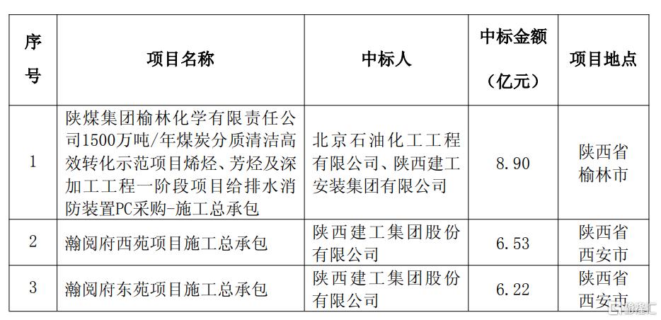 公司中标项目概况 - 2025年7月公司及下属子公司中标3个5亿元以上施工项目 总金额达21.65亿元[1] - 项目涵盖能源化工基础设施和房地产开发两大领域[1] 具体项目明细 - 陕煤集团榆林化学煤炭转化项目给排水消防装置PC总承包 中标金额8.9亿元 由北京石油化工工程与陕西建工安装集团联合承建[1] - 瀚阅府西苑项目施工总承包 中标金额6.53亿元 由陕西建工集团股份有限公司承建[1] - 瀚阅府东苑项目施工总承包 中标金额6.22亿元 由陕西建工集团股份有限公司承建[1] 项目地域分布 - 2个项目位于陕西省西安市 合计金额12.75亿元[1] - 1个项目位于陕西省榆林市 金额8.9亿元[1]
