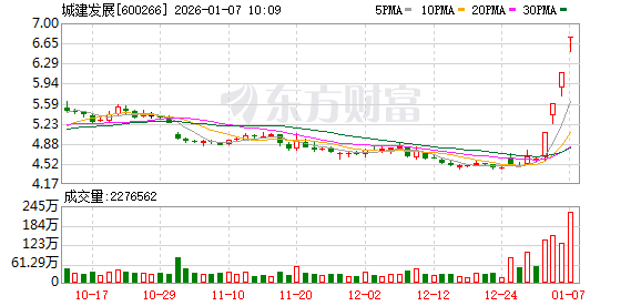 城建发展盘中涨停,已连收4个涨停板,截至9:26,该股报6.75元,换手率0.31%,成交量636.17万股, 成交金额4294.15万元,涨停板封单金额为3.08亿元。连续涨停期间,该股累计上涨46.42%,累计换手 率为20.49%。最新A股总市值达140.11亿元。 证券时报·数据宝统计,两融数据来看,该股最新(1月6日)两融余额为5.68亿元,其中,融资余额5.61 亿元,较前一个交易日增加3026.06万元,环比增长5.70%,近4日累计增加1777.63万元,环比增长 3.27%。 龙虎榜数据显示,该股因连续三个交易日内,涨幅偏离值累计达20%、日涨幅偏离值达7%上榜龙虎榜1 次,买卖居前营业部中,机构净卖出1.09亿元,沪股通累计净买入374.21万元,营业部席位合计净买入 1.02亿元。(数据宝) 近日该股表现 | 日期 | 当日涨跌幅(%) | 换手率(%) | 主力资金净流入(万元) | | --- | --- | --- | --- | | 2026.01.06 | 10.04 | 6.11 | 1493.65 | | 2026.01.05 | 10.06 | 7.42 | 1712.4 ...