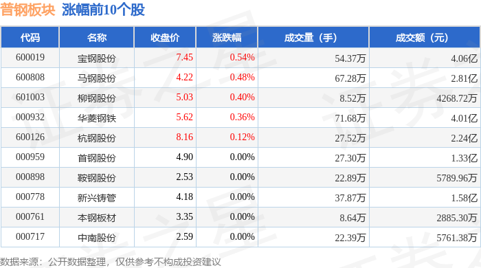 证券之星消息,12月30日普钢板块较上一交易日下跌0.72%,武进不锈领跌。当日上证指数报收于 3965.12,下跌0.0%。深证成指报收于13604.07,上涨0.49%。普钢板块个股涨跌见下表: | 代码 | 名称 | 收盘价 | 涨跌幅 | 成交量(手) | 成交额(元) | | | --- | --- | --- | --- | --- | --- | --- | | 600808 | 马钢股份 | 4.20 | 0.24% | 75.28万 | | 3.17亿 | | 600126 | 杭钢股份 | 8.15 | -0.12% | 27.17万 | | 2.22亿 | | 600282 | 南钢股份 | 5.38 | -0.19% | 54.41万 | | 2.94亿 | | 600019 | 宝钢股份 | 7.41 | -0.40% | 56.30万 | | 4.19亿 | | 000778 | 新兴铸管 | 4.18 | -0.48% | 45.90万 | | 1.91亿 | | 000959 | 首钢股份 | 4.90 | -0.61% | 40.13万 | | 1.96/Z | | 6016 ...