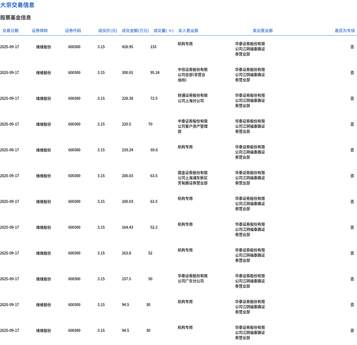 大宗交易概况 - 2025年9月17日维维股份发生大宗交易成交781.54万股,成交金额2461.87万元,占当日总成交额7.33% [1] - 成交价格3.15元,较市场收盘价3.53元折价10.76% [1] - 所有交易均通过华泰证券江阴福泰路营业部卖出 [2] 交易结构分析 - 共发生11笔大宗交易,单笔成交量30万股至133万股不等,单笔成交金额94.5万元至418.95万元 [2] - 买入方包括机构专用席位(6笔)、券商总部及分公司(5笔) [2] - 机构专用席位合计买入约309.24万股,占比39.57% [2] 价格与流动性 - 全部交易均按3.15元统一价格成交,较市价折让10.76% [1][2] - 大宗交易总额占当日二级市场成交比重达7.33%,显示大宗交易对当日流动性有显著影响 [1]
