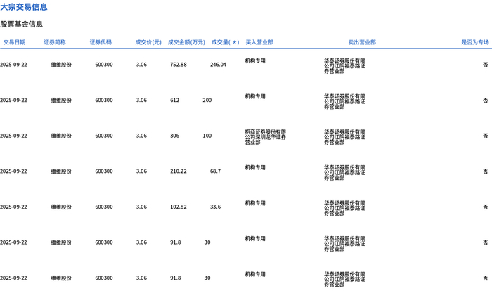 大宗交易概况 - 2025年9月22日维维股份发生大宗交易总成交量708.34万股 总成交金额2167.52万元 占当日总成交额18.14% [1] - 成交均价3.06元 较当日市场收盘价3.36元折价8.93% [1] 交易明细分析 - 共发生7笔大宗交易 单笔成交量在30万股至246.04万股之间 单笔成交金额在91.8万元至752.88万元之间 [2] - 买入营业部出现4次"机构专用" 显示机构投资者参与度较高 [2] - 成交价格全部为3.06元 与大宗交易均价一致 [2] 交易结构特征 - 最大单笔交易成交量246.04万股 成交金额752.88万元 [2] - 最小单笔交易成交量30万股 成交金额91.8万元 [2] - 交易主要通过机构专用席位进行 显示机构投资者主导当日大宗交易 [2]
