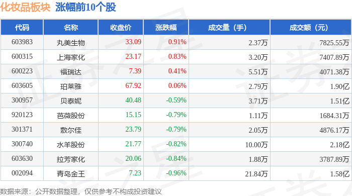 市场整体表现 - 2023年12月24日,化妆品板块整体上涨0.73%,表现强于大盘,当日上证指数上涨0.53%,深证成指上涨0.88% [1] - 板块内个股涨多跌少,领涨股为嘉亨家化,单日涨幅达8.32% [1] 个股价格与交易表现 - **嘉亨家化**收盘价41.51元,上涨8.32%,成交额3.25亿元 [1] - **青松股份**收盘价8.26元,上涨4.03%,成交额2.72亿元 [1] - **锦盛新材**收盘价16.44元,上涨1.54%,成交额5332.58万元 [1] - **上海家化**收盘价22.93元,上涨1.37%,成交额6938.73万元 [1] - **水羊股份**收盘价21.62元,上涨1.22%,成交额1.86亿元 [1] - **敷尔佳**收盘价24.02元,上涨0.88%,成交额4224.01万元 [1] - **青岛金王**收盘价7.14元,上涨0.85%,成交额7572.87万元 [1] - **珀莱雅**收盘价68.16元,上涨0.35%,成交额1.43亿元 [1][2] - **拉芳家化**收盘价20.11元,上涨0.30%,成交额3358.47万元 [1][2] - **丸美股份**收盘价32.62元,下跌1.15%,是表中跌幅最大的个股 [2] - **福瑞达**收盘价7.33元,下跌0.41% [2] - **贝泰妮**收盘价40.83元,上涨0.17%,成交额1.04亿元 [2] - **科思股份**收盘价13.94元,上涨0.29%,成交额1.19亿元 [2] 板块资金流向 - 当日化妆品板块整体呈现主力资金净流出5233.32万元,而游资和散户资金分别净流入491.42万元和4741.89万元 [2] - **青松股份**主力资金净流入818.31万元,占成交额比例3.01% [3] - **锦盛新材**主力资金净流入459.82万元,占成交额比例8.62% [3] - **上海家化**主力资金净流入174.88万元,占成交额比例2.52% [3] - **水羊股份**主力资金净流入146.34万元,占成交额比例0.79% [3] - **敷尔佳**主力资金净流出544.88万元,占成交额比例-12.90%,是表中主力净流出比例最高的个股 [3] - **福瑞达**主力资金净流出374.47万元,占成交额比例-8.28% [3] - **科思股份**主力资金净流出383.46万元,占成交额比例-3.23% [3]