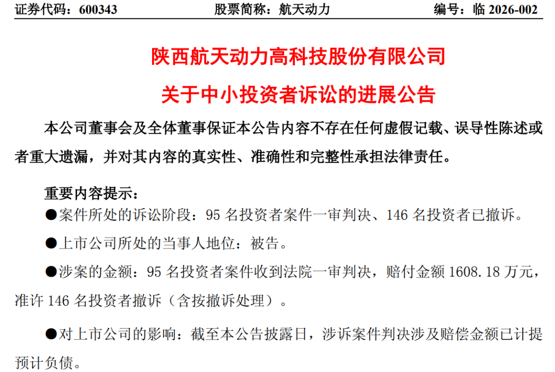 央广网北京1月9日消息(记者 邹煦晨)近日,航天动力(600343.SH)投资者索赔案一审落槌,公司早 年财务造假的旧案再度浮出水面。 357起诉讼尚未开庭审理 航天动力近期披露的诉讼进展公告显示,公司已收到陕西省西安市中级人民法院的一审判决及裁定。在 相关投资者诉公司证券虚假陈述责任纠纷案件中,95 名投资者的诉讼案件已宣判,公司需向该部分投 资者赔付1608.18万元(含诉讼费等相关费用);另有146名投资者撤回起诉,并获得法院准许。截至公 告披露日,公司累计涉及的投资者诉讼案件已达615起,其中357起案件尚未开庭审理,涉诉金额高达 2845.63万元。 另外,针对近期股价异动,航天动力明确提示,公司主营业务与商业航天无关,亦无相关对外投资,仅 少量承接火箭发动机零部件加工业务,该业务营收占比不足2%,且目前处于亏损状态。 值得关注的是,除航天动力主动撇清与商业航天的关联外,多家从事商业航天相关业务的上市公司也纷 纷发布风险提示公告,直言公司股票击鼓传花效应十分明显,交易风险极大,存在短期大幅下跌的风 险。 航天动力表示,截至2026年1月6日公告披露日,涉诉案件判决涉及赔偿金额已计提预计负债。公司将密 ...
