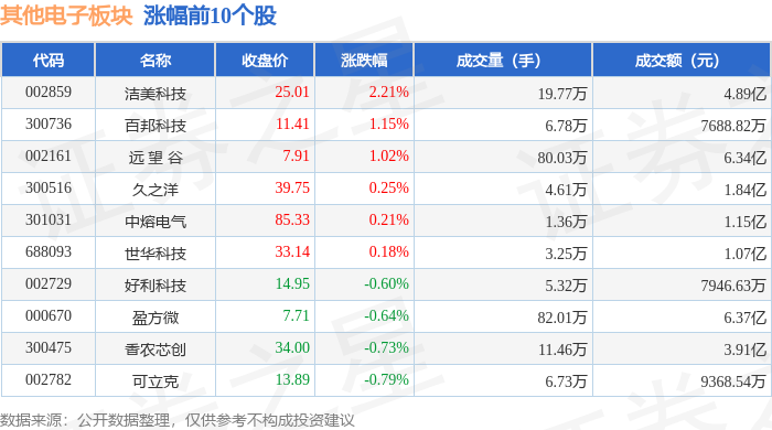 板块表现 - 其他电子板块当日下跌1.76% 领跌个股为旭光电子(跌幅6.37%)[1] - 上证指数上涨0.17%至3615.72点 深证成指下跌0.77%至11203.03点[1] - 板块内10只个股上涨 20只个股下跌 涨幅最高为洁美科技(2.21%)跌幅最深为旭光电子(6.37%)[1][2] 个股交易数据 - 成交量前三分别为远望谷(80.03万手)、盈方微(82.01万手)、旭光电子(71.39万手)[1][2] - 成交额前三为沃尔核材(14.93亿元)、深圳华强(5.16亿元)、中电港(5.01亿元)[2] - 香农芯创主力资金净流入1479.76万元(占比3.78%) 远望谷主力净流入1329.86万元(占比2.10%)[3] 资金流向 - 板块主力资金净流出7.1亿元 游资资金净流入1.13亿元 散户资金净流入5.97亿元[2] - 汉朔科技游资净流入981.85万元(占比8.84%) 世华科技游资净流入1180.14万元(占比11.05%)[3] - ST新业主力净流出326.68万元(占比-8.48%) 睿能科技主力净流出357.58万元(占比-6.69%)[3]