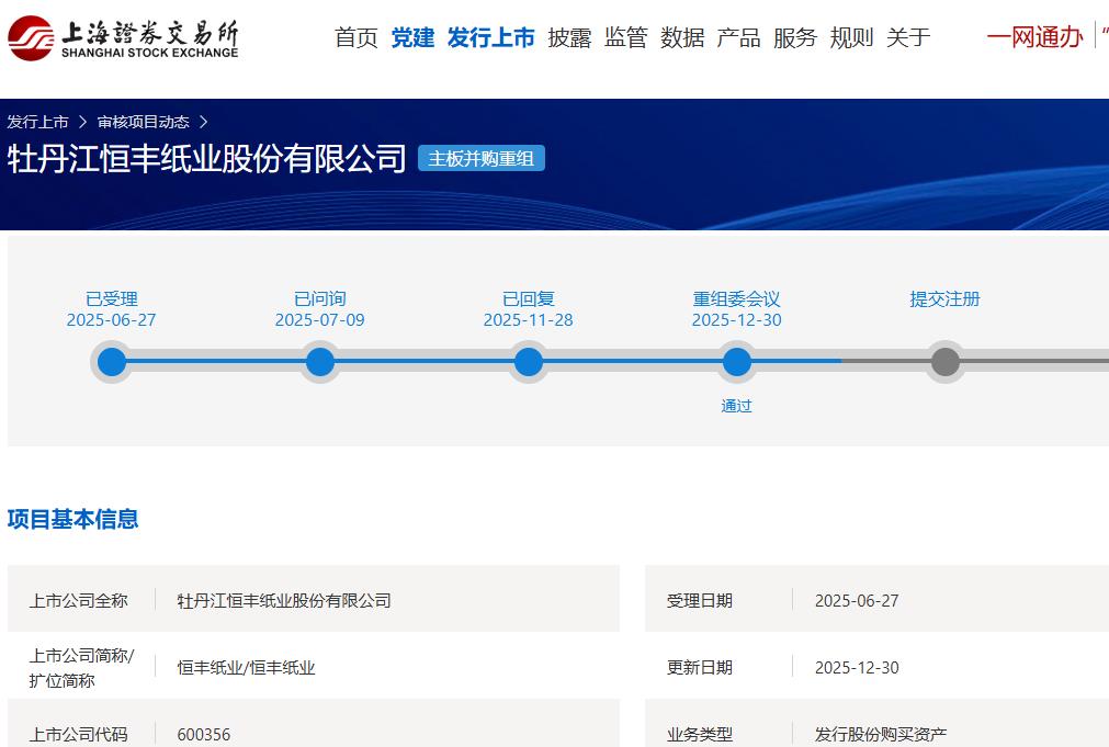 交易概述 - 牡丹江恒丰纸业股份有限公司计划通过发行股份的方式购买四川锦丰纸业股份有限公司100%股权 [1] - 该交易已获得上海证券交易所并购重组审核委员会审核通过 审议结果为交易符合重组条件和信息披露要求 [1] 审核进展 - 上海证券交易所并购重组审核委员会于2025年12月30日召开2025年第23次会议审议了该交易 [1] - 交易尚需获得中国证券监督管理委员会同意注册后方可实施 [2] 后续程序 - 交易最终能否取得注册以及取得注册的时间均存在不确定性 [2] - 公司将根据事项进展严格按照法律法规要求及时履行信息披露义务 [2]