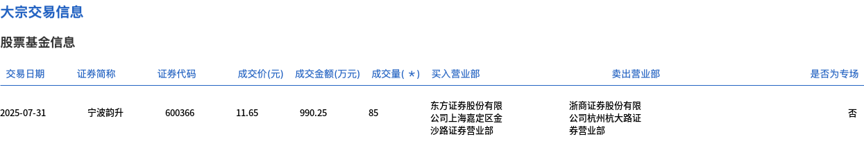 大宗交易概况 - 7月31日大宗交易成交85万股,成交额990.25万元,占当日总成交额1.48% [1] - 成交价11.65元,较市场收盘价11.89元折价2.02% [1] 交易细节 - 买方为东方证券股份有限公司上海嘉定区金营业部 [2] - 卖方为浙商证券股份有限公司杭州杭大路证券营业部 [2] - 交易通过大宗交易平台完成,证券代码600366 [2]