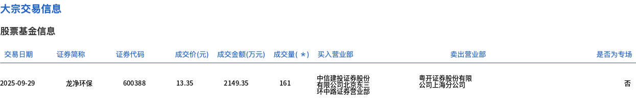 大宗交易概况 - 龙净环保于2025年9月29日发生大宗交易,成交161万股,成交金额2149.35万元,占当日总成交额的5.54% [1] - 成交价格为13.35元,较当日市场收盘价14.88元折价10.28% [1] 交易细节 - 买入方为中信建投证券股份有限公司北京东兰营业部 [2] - 卖出方为粤开证券股份有限公司上海分公司 [2] - 证券代码600388,证券简称龙净环保 [2]