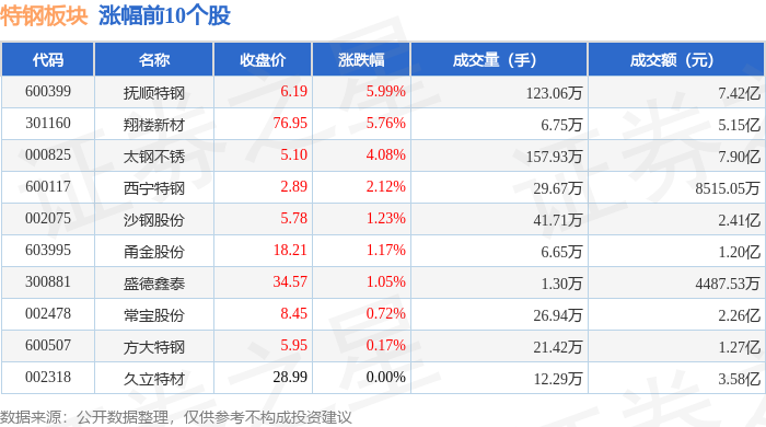 特钢板块市场表现 - 2023年12月30日,特钢板块整体上涨0.24%,表现强于上证指数(下跌0.0%),但弱于深证成指(上涨0.49%)[1] - 板块内个股表现分化,翔楼新材领涨,涨幅为4.10%,久立特材上涨2.38%,中信特钢上涨0.56%,而抚顺特钢下跌2.33%,常宝股份下跌2.17%[1][2] - 当日板块主力资金净流出9969.27万元,游资资金净流出1213.46万元,但散户资金净流入1.12亿元,显示市场资金流向存在分歧[2] 领涨个股分析 - 翔楼新材收盘价为68.81元,上涨4.10%,成交量为6.08万手,成交额为4.14亿元,主力资金净流入495.85万元,净占比1.20%[1][3] - 久立特材收盘价为27.96元,上涨2.38%,成交量为15.00万手,成交额为4.20亿元,但主力资金净流出1005.68万元,净占比-2.40%[1][3] - 中信特钢收盘价为16.16元,上涨0.56%,成交量为9.62万手,成交额为1.55亿元,主力资金净流入166.64万元,净占比1.08%[1][3] 资金流向明细 - 常宝股份主力资金净流出规模最大,达2218.71万元,净占比-8.39%,同时游资净流出850.66万元,但散户净流入3069.37万元[3] - 抚顺特钢成交量最大,达72.31万手,成交额4.26亿元,但股价下跌2.33%[2] - 太钢不锈成交额最高,达4.59亿元,成交量93.51万手,股价微跌0.20%[1][2] - 部分个股如沙钢股份(主力净流入293.19万元)和西宁特钢(主力净流入192.69万元)在股价持平或下跌时获得主力资金小幅流入[3]
