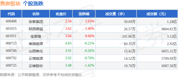 板块整体表现 - 焦炭板块整体下跌0.74% 领跌个股为宝泰隆[1] - 上证指数上涨0.13%至3812.22点 深证成指上涨0.38%至12557.68点[1] - 板块主力资金净流出5363.59万元 游资净流出2669.39万元 散户净流入8032.97万元[1] 个股价格变动 - 安泰集团涨幅1.71%居首 收盘价2.38元 成交额9696.96万元[1] - 云维股份平盘收报3.48元 成交额4770.47万元[1] - 山西焦化下跌0.51%至3.89元 陕西黑猫下跌0.83%至3.59元[1] - 云煤能源下跌1.02%至3.88元 美锦能源下跌1.04%至4.78元[1] - 宝泰隆领跌1.32%至3.00元 成交额1.57亿元[1] 资金流向分布 - 山西焦化主力净流出94.85万元(-1.43%) 游资净流出574.86万元(-8.66%) 散户净流入669.70万元(10.09%)[2] - 陕西黑猫主力净流出193.80万元(-3.08%) 游资净流出340.27万元(-5.41%) 散户净流入534.07万元(8.49%)[2] - 安泰集团主力净流出514.95万元(-5.31%) 游资净流出933.17万元(-9.62%) 散户净流入1448.12万元(14.93%)[2] - 云维股份主力净流出520.38万元(-10.91%) 游资净流入470.66万元(9.87%) 散户净流入49.72万元(1.04%)[2] - 云煤能源主力净流出778.91万元(-13.69%) 游资净流出436.90万元(-7.68%) 散户净流入1215.82万元(21.36%)[2] - 美锦能源主力净流出960.16万元(-4.32%) 游资净流出675.56万元(-3.04%) 散户净流入1635.72万元(7.36%)[2] - 宝泰隆主力净流出2300.54万元(-14.62%) 游资净流出179.29万元(-1.14%) 散户净流入2479.83万元(15.76%)[2]