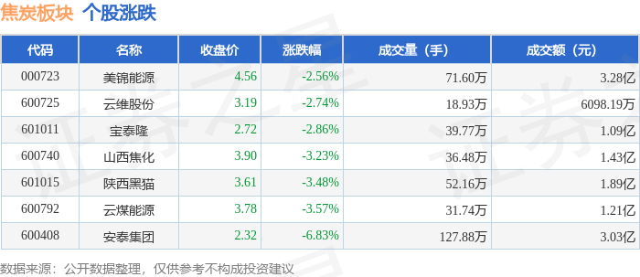 板块表现 - 焦炭板块单日上涨1.34% 领涨股为安泰集团[1] - 上证指数上涨0.96%至3617.6点 深证成指上涨0.59%至11106.96点[1] 个股涨跌 - 安泰集团收盘价2.33元 涨幅4.02% 成交量55.92万手 成交额1.29亿元[1] - 山西焦化收盘价4.03元 涨幅2.28% 成交量25.38万手 成交额1.01亿元[1] - 宝泰隆收盘价2.79元 涨幅2.20% 成交量30.24万手 成交额8341.36万元[1] - 陕西黑猫收盘价3.73元 涨幅1.36% 成交量28.87万手 成交额1.06亿元[1] - 美锦能源收盘价4.62元 涨幅0.65% 成交量40.06万手 成交额1.847亿元[1] - 云维股份收盘价3.28元 涨幅0.61% 成交量11.70万手 成交额3823.24万元[1] - 云煤能源收盘价3.86元 涨幅0.52% 成交量20.11万手 成交额7703.20万元[1] 资金流向 - 板块主力资金净流入1578.05万元 游资资金净流入643.54万元 散户资金净流出2221.59万元[1] - 山西焦化主力净流入1618.21万元 占比16.07% 游资净流出355.34万元 散户净流出1262.87万元[2] - 安泰集团主力净流入912.38万元 占比7.09% 游资净流入94.29万元 散户净流出1006.67万元[2] - 陕西黑猫主力净流入483.31万元 占比4.54% 游资净流出201.67万元 散户净流出281.64万元[2] - 宝泰隆主力净流入247.70万元 占比2.97% 游资净流入2.45万元 散户净流出250.15万元[2] - 云维股份主力净流出31.89万元 游资净流出39.45万元 散户净流入71.33万元[2] - 云煤能源主力净流出736.88万元 游资净流入346.66万元 散户净流入390.22万元[2] - 美锦能源主力净流出914.78万元 游资净流入796.58万元 散户净流入118.20万元[2]