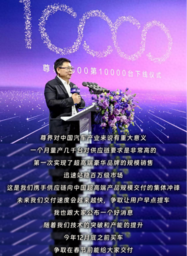 中国汽车史册中的里程碑节点,正接连出现。 12月23日,鸿蒙智行发布最新数据,尊界S800交付破万,创下百万级豪华车交付速度新纪 录。一周前,尊界S800第10000台下线仪式在尊界超级工厂举行。活动现场举行了尊界S800 车主交付仪式,华为常务董事、产品投资评审委员会主任、终端BG董事长余承东与安徽江淮 汽车集团董事长项兴初向车主代表交付新车钥匙。 "尊界S800展现出强大的用户口碑与品牌认可度。同时,尊界S800拉动中国供应链企业一起 攻克最难的高端超豪华领域,牵引中国汽车产业链能力再上新台阶。"余承东表示。 即将结束的 2025年,尊界S800以绝对现象级的表现改写了中国汽车行业、市场格局,重塑 了消费者对于超豪华车的消费观。业界开始出现一种声音——由"尊界效应"引发的价值突破样 本,已悄然形成。 从饱受争议,到行业范本 从不被看好到逆袭热销、领跑市场,尊界只用了一年多时间。 更早些时候,长江商学院 CEO班走进了上海鸿蒙智行体验中心,到访的长江商学院高层管理 教育项目副院长周春生及CEO班的优秀企业家在试乘体验尊界S800时频频点头;2025上海劳 力士大师赛期间,中国网球运动员张之臻开着自己的尊界S ...