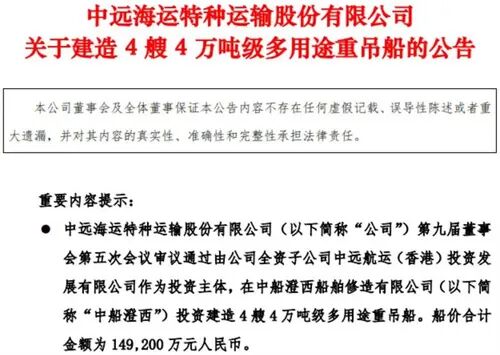 公告截图 公告显示,为了加快推进公司发展战略转型升级,进一步做优、做强多用途重吊船船队,经第九届董事会第五次会议审议通过,将由公司全资子公司中远 航运(香港)投资发展有限公司作为投资主体,在中船澄西船舶修造有限公司(以下简称"中船澄西")投资建造4艘4万吨级多用途重吊船,船价合计金额 为149,200万元人民币,预计首艘船计划2028年6月或之前交付,其他陆续计划在2029年2月底前交付。 航运界网消息,近日,中远海运特种运输股份有限公司(证券代码:600428,证券简称:中远海特)发布公告,将建造4艘4万吨级多用途重吊船。 公开资料显示,中远海运特运主营特种船运输及相关业务,目前拥有规模和综合实力居世界前列的特种运输船队,经营管理半潜船、多用途重吊船、纸浆 船、汽车船、沥青船等各类型船舶超200艘近1000万载重吨。 据了解,中远海运特运的这份订单是去年12月初中远海运集团与中国船舶集团签署的总计87艘新船订单之一。据悉,上述87艘新船合同总金额约500亿元 人民币,其中跨境人民币结算约470亿元,创下中国船舶工业史上单次合作签约金额最高、跨境人民币结算金额最高的"双记录"。 中远海特指出,近年来,快速发展 ...