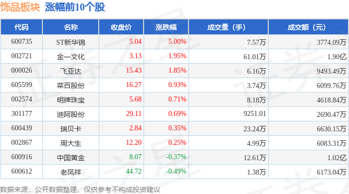 饰品板块12月23日跌0.16%,ST新华锦领跌,主力资金净流入97.11万元