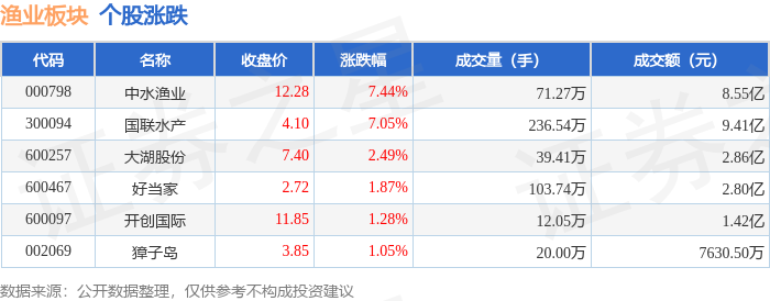 以上内容为证券之星据公开信息整理,由AI算法生成(网信算备310104345710301240019号),不构成投资建议。 从资金流向上来看,当日渔业板块主力资金净流入9456.8万元,游资资金净流出5624.27万元,散户资金 净流出3832.52万元。渔业板块个股资金流向见下表: | 代码 | 名称 | 主力净流入(元) | 主力净占比 游资净流入 (元) | | 游资净占比 散户净流入 (元) | | 散户净占比 | | --- | --- | --- | --- | --- | --- | --- | --- | | 000798 中水渔业 | | 6399.63万 | 7.48% | -1212.18万 | -1.42% | -5187.45万 | -6.06% | | 300094 国联水产 | | 2596.20万 | 2.76% | -3400.08万 | -3.61% | 803.89万 | 0.85% | | 600467 | 好当家 | 2585.48万 | 9.23% | -920.06万 | -3.28% | -1665.42万 | -5.94% | | 002069 | 獐子岛 | ...