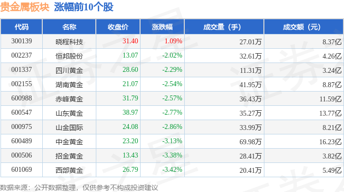 从资金流向上来看,当日贵金属板块主力资金净流出5.34亿元,游资资金净流入2.92亿元,散户资金净流 入2.42亿元。贵金属板块个股资金流向见下表: | 代码 | 名称 | 收盘价 | 涨跌幅 | 成交量(手) | 成交额(元) | | | --- | --- | --- | --- | --- | --- | --- | | 300139 | 院在个技 | 31.40 | 1.09% | 27.01万 | | 8.37 Z | | 002237 | 恒邦股份 | 13.07 | -2.02% | 32.61万 | | 4.26亿 | | 001337 | 四川黄金 | 28.60 | -2.29% | 11.31万 | | 3.24亿 | | 002155 | 湖南黄金 | 21.07 | -2.54% | 41.95万 | | 8.87亿 | | 600988 | 赤峰黄金 | 31.79 | -2.57% | 36.43万 | | 11.59亿 | | 600547 | 山东黄金 | 38.97 | -2.77% | 35.27万 | | 13.77亿 | | 000975 | 山舍国际 | 24.08 ...