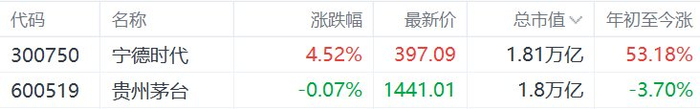 宁德时代股价表现 - 宁德时代A股上涨4.52% 最新股价397.09元[1][2] - 公司总市值达1.81万亿元[2] - 年初至今累计涨幅53.18%[2] 贵州茅台股价表现 - 贵州茅台下跌0.07% 最新股价1441.01元[2] - 公司总市值1.8万亿元[2] - 年初至今累计下跌3.70%[2] 市值对比 - 宁德时代市值1.81万亿元超越贵州茅台的1.8万亿元[1][2] - 两者市值差距约100亿元[2]