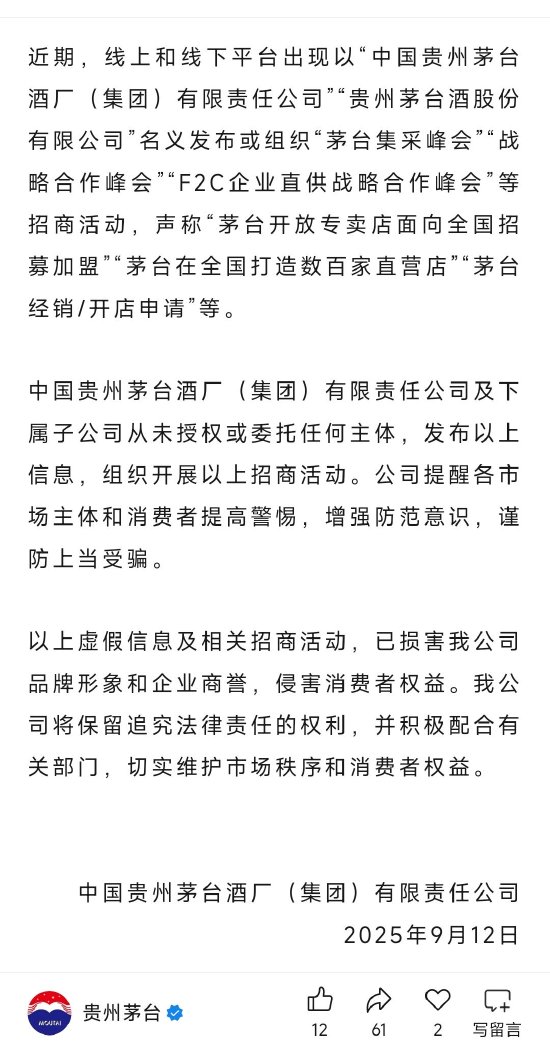 虚假招商活动声明 - 茅台集团及子公司从未授权任何主体发布招商信息或组织相关活动 提醒市场主体和消费者提高警惕防范诈骗 [1][3] - 虚假信息涉及"茅台集采峰会""战略合作峰会""F2C企业直供战略合作峰会"等名义 声称开放专卖店招募加盟及打造数百家直营店 [3] - 虚假活动已损害公司品牌形象和企业商誉 公司将保留追究法律责任的权利并配合相关部门维护市场秩序 [1]
