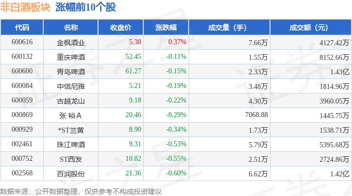 | 代码 | 名称 | 收盘价 | 涨跌幅 | 成交量(手) | 成交额(元) | | | --- | --- | --- | --- | --- | --- | --- | | 600616 | 金枫酒业 | 5.38 | 0.37% | 7.66万 | | 4127.42万 | | 600132 | 重庆啤酒 | 52.45 | -0.11% | 1.55万 | | 8152.66万 | | 600600 | 飘盤砂加 | 61.27 | -0.15% | 2.33万 | | 1.43亿 | | 600084 | 中信尼雅 | 5.21 | -0.19% | - 3.48万 | | 1814.96万 | | 600059 | 古越龙山 | 9.18 | -0.22% | 4.30万 | | 3960.05万 | | 000869 | 张 裕A | 20.46 | -0.29% | 7068.88 | | 1445.75万 | | 000929 | *ST兰黄 | 8.90 | -0.34% | 1.73万 | | 1538.71万 | | 002461 | 珠江啤酒 | 9.31 | -0.53% | 5 ...