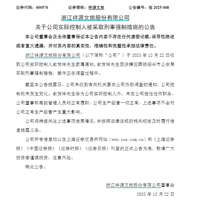 交建股份(603815.SH)今日公告称, 公司实际控制人俞发祥因涉嫌犯罪被绍兴市公安局采取刑事强制措施, 案件正在调查过程中。 目前公司未收到有关机关要求公司协助调查的通知,控制权未发生变化,生产经营一切正常,不会对公司正常生产经营产生重大影响。 祥源文旅(600576.SH)同日公告称, 公司实际控制人俞发祥因涉嫌犯罪被绍兴市公安局采取刑事强制措施, 案件正在调查过程中。 截至公告披露日,公司未收到有关机关要求公司协助调查的通知,公司控制权未发生变化。俞发祥未在公司担任任何职务,公司生产经营一切正 常,上述事项不会对公司正常生产经营产生重大影响。 浙江祥源文旅股份有限公司 关于公司实际控制人被采取刑事强制措施的公告 本公司董事会及全体董事保证本公告内容不存在任何虚假记载、误导性陈述 或者重大遗漏,并对其内容的真实性、准确性和完整性承担法律责任。 浙江祥源文旅股份有限公司(以下简称"公司")于2025年12月22日收 到公司实际控制人俞发祥先生家属通知,俞发祥先生因涉嫌犯罪被绍兴市公安局 采取刑事强制措施,案件正在调查过程中。 截至本公告披露日,公司未收到有关机关要求公司协助调查的通知,公司控 制权未发生变 ...