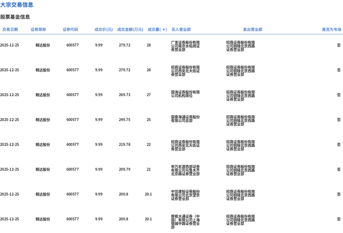 大宗交易概况 - 2025年12月25日,精达股份(600577)发生大宗交易,总成交1258.2万股,总成交金额1.26亿元,占该股当日总成交额的4.83% [1] - 本次大宗交易的成交均价为9.99元,较当日市场收盘价12.21元折价18.18% [1] 交易明细分析 - 根据交易明细表,当日共发生多笔大宗交易,成交价格主要为9.99元,部分记录显示异常价格(如66'6、6676、ਰੇ ਕੇਰੇ等,可能为数据错误或乱码)[2][3] - 单笔成交金额从数百万元至数千万元不等,例如一笔成交金额为2097.9万元,成交量为210万股 [3] - 部分交易的卖出方或买入方营业部信息显示为“机构专用” [3] 交易参与方 - 交易涉及多个不同的营业部,但部分营业部名称信息存在乱码或异常字符,例如“公司画古文生所は”、“想曾是在要求”等 [2] - 明确记录有机构投资者参与,多笔交易的对手方为“机构专用”席位 [3]
