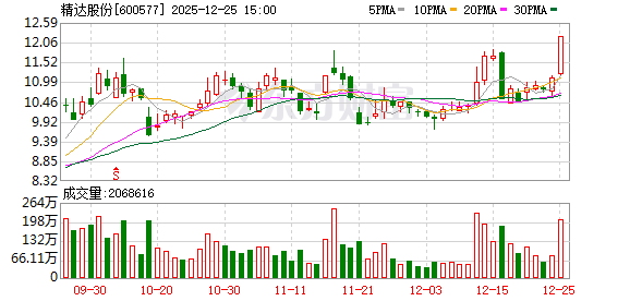 证券时报·数据宝统计显示,精达股份今日收盘价为12.21元,上涨10.00%,日换手率为9.63%,成交额 为24.77亿元,全天主力资金净流入3.79亿元,近5日该股累计上涨16.95%,近5日资金合计净流入4.50亿 元。 两融数据显示,该股最新融资余额为19.26亿元,近5日增加1.01亿元,增幅为5.54%。(数据宝) 12月25日精达股份大宗交易一览 精达股份12月25日大宗交易平台共发生23笔成交,合计成交量1258.20万股,成交金额1.26亿元。成交价 格均为9.99元,相对今日收盘价折价18.18%。从参与大宗交易营业部来看,机构专用席位共出现在5笔 成交的买方或卖方营业部中,合计成交金额为2697.30万元,净买入2697.30万元。 进一步统计,近3个月内该股累计发生142笔大宗交易,合计成交金额为6.59亿元。 | 60.00 | 599.40 | 9.99 | -18.18 | 机构专用 | 招商证券股份有限公司 | | --- | --- | --- | --- | --- | --- | | | | | | | 铜陵北京西路证券营业 | | | | | | | 部 | | 50. ...