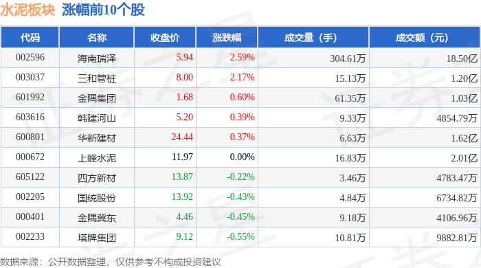 证券之星消息,12月26日水泥板块较上一交易日下跌0.49%,四川金顶领跌。当日上证指数报收于 3963.68,上涨0.1%。深证成指报收于13603.89,上涨0.54%。水泥板块个股涨跌见下表: | 代码 | 名称 | 收盘价 | 涨跌幅 | 成交量(手) | 成交额(元) | | | --- | --- | --- | --- | --- | --- | --- | | 002596 | 烘脂屋與 | 5.94 | 2.59% | 304.61万 | | 18.50亿 | | 003037 | 三和营桩 | 8.00 | 2.17% | 15.13万 | | 1.20亿 | | 601992 | 全隅集团 | 1.68 | 0.60% | 61.35万 | | 1.03亿 | | 603616 | 韩建河山 | 5.20 | 0.39% | 9.33万 | | 4854.79万 | | 600801 | 华新建材 | 24.44 | 0.37% | 6.63万 | | 1.62亿 | | 000672 | 上峰水泥 | 11.97 | 0.00% | 16.83万 | | 2.01亿 | | 60512 ...