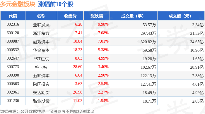 多元金融板块市场表现 - 2024年1月12日,多元金融板块整体表现强劲,较上一交易日上涨1.99%,领涨个股为亚联发展,涨幅达9.98% [1] - 当日主要股指同步上涨,上证指数报收于4165.29点,上涨1.09%,深证成指报收于14366.91点,上涨1.75% [1] 板块个股涨跌情况 - 涨幅居前的个股包括:亚联发展(涨9.98%,收盘价6.28元)、浙江东方(涨7.08%,收盘价7.41元)、越秀资本(涨7.01%,收盘价10.84元)、华金资本(涨5.38%,收盘价18.23元)、*ST仁东(涨4.99%,收盘价8.63元)[1] - 部分个股出现下跌,跌幅较大的包括:渤海租赁(跌2.85%,收盘价4.09元)、*ST熊猫(跌2.12%,收盘价8.31元)、江苏金租(跌1.59%,收盘价6.20元)[2] - 成交额较高的个股包括:越秀资本(成交额34.65亿元)、拉卡拉(成交额28.91亿元)、浙江东方(成交额21.52亿元)[1] 板块资金流向 - 当日多元金融板块整体呈现主力资金和游资净流出状态,主力资金净流出2234.27万元,游资资金净流出7882.56万元 [2] - 散户资金呈现净流入状态,净流入额为1.01亿元 [2] - 个股层面,拉卡拉获得主力资金净流入6243.55万元,主力净占比2.16%,瑞达期货主力净流入4623.25万元,主力净占比9.39% [3] - 越秀资本获得游资净流入9701.15万元,游资净占比2.80%,但主力净流入仅为2031.39万元,且散户净流出1.17亿元 [3] - 部分个股如浙江东方、陕国投A呈现主力净流入但游资净流出的分化局面 [3]