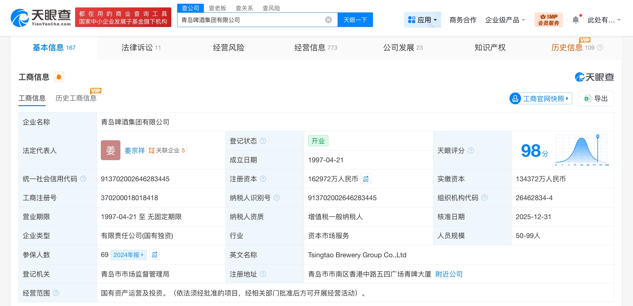 南方财经1月5日电,天眼查工商信息显示,近日,青岛啤酒集团有限公司发生工商变更,注册资本由约13.4亿人民币增至约16.3亿人民币,增幅约21%,同 时,多位高管发生变更。该公司成立于1997年4月,法定代表人为姜宗祥,经营范围为国有资产运营及投资。股东信息显示,该公司青岛市人民政府国有资 产监督管理委员会全资持股。 | 2天眼查 都在用的商业童询工具 | 登公司 宣老板 宣天系 宣风险 | | | | --- | --- | --- | --- | | 国家中小企业发展子基金旗下机构 TianYanCha.com | 青岛啤酒集团有限公司 | | × 天眼一下 | | 基本信息 167 法律诉讼 11 | 经营风险 | 经营信息 773 | 公司发 | 变更记录 55 3 ● | 序号 | 变更日期 | 变更项目 | 变更前 | | --- | --- | --- | --- | | | 2025-12-31 | 投资人变更(包括出资 额、出资方式、出资日 期、投资人名称等) | 1.股东(发起人)名称:青岛市国有资产管理局,证件(照)类型:其他,证 件(照)号码:***,认缴出资额:134372万,币种: ...